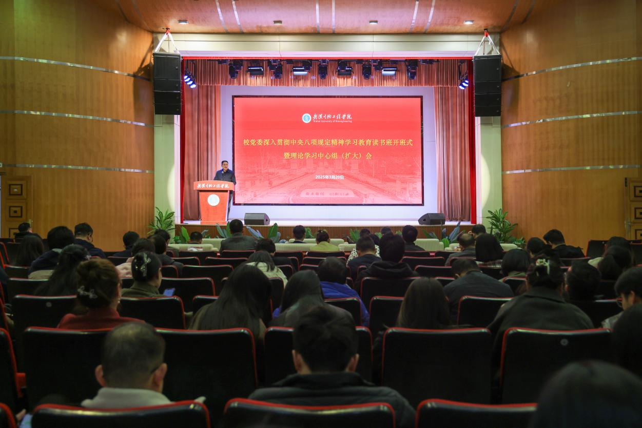 本网讯(记者 任丽琼 摄影 谈宇锋)3月20日,校党委举行深入贯彻中央八项规定精神学习教育读书班开班式暨理论学习中心组(扩大)会,深入学习领会全国两会精神,全面落实《关于在全党开展深入贯彻中央八项规定精神学习教育的通知》等上级文件要求,集体研学习近平总书记关于深入贯彻中央八项规定精神学习教育的重要讲话、重要指示精神,关于加强党的作风建设的重要论述等内容。校党委书记江珩主持开班式并作动员讲话。