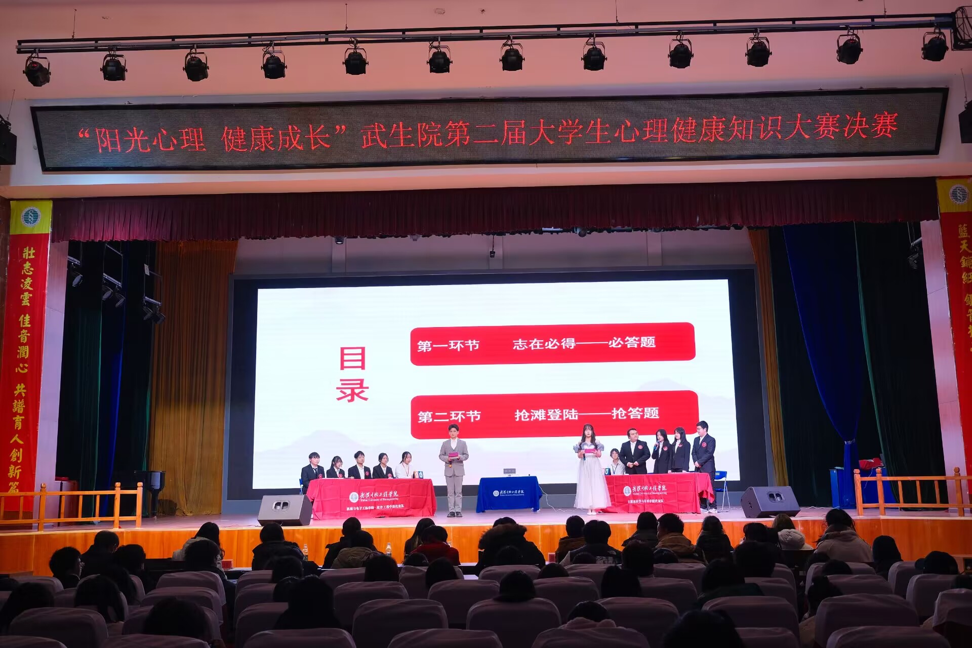 本网讯(通讯员 欧欣怡)12月24日晚,“阳光心理 健康成长”武生院第二届大学生心理健康知识大赛决赛在大礼堂举行。校长助理余仕良出席大赛并致辞,学生工作处、学生公寓管理与服务中心、青春护航学院负责人以及全体心理健康教师,各学院心理辅导员和学生代表800余人参会。