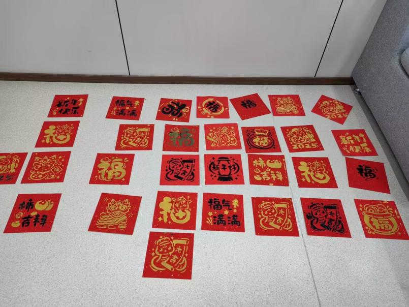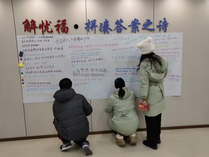 游园会现场年味十足,红灯笼高挂,各式新春标语、窗花贴满四壁。游园会以“福聚一堂签”集五福拉开序幕,每位师生写福字并粘贴到签到墙上进行签到即可领取一张特制的“集福卡”,集齐“智慧”“幸运”“记忆”“践行”“解忧”福,寓意“五福临门”,分别对应“巧思妙想猜灯谜”“好运套圈领奖品”“蛇年知识大挑战”“非遗DIY手工拓印”“拼凑答案之诗”五个游戏。游戏在钱学森学院多个教室同步展开。