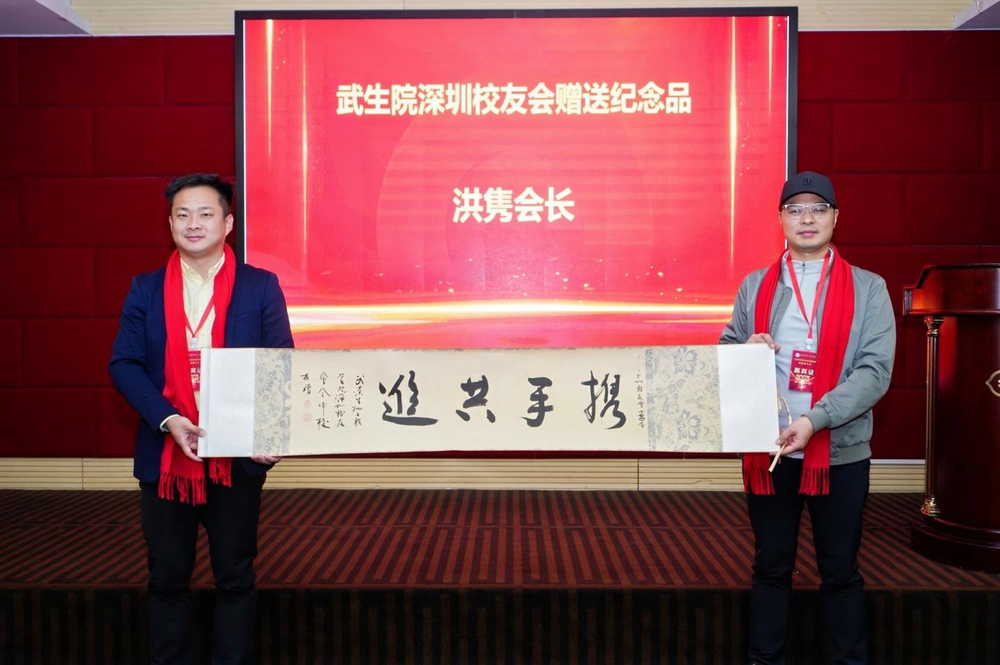 深圳校友会会长、深圳市耀冠科技有限公司总经理洪隽向广州校友会赠送书法作品《携手共进》