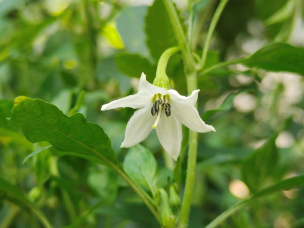 一年生草本或灌木状;株高达80厘米;茎近无毛或被微柔毛,分枝稍之字形折曲;叶长圆状卵形、卵形或卵状披针形,全缘,先端短渐尖或尖,基部窄楔形;花单生或数朵簇生,俯垂;花萼杯状,齿不显著;花冠白色,裂片卵形;花药灰紫色;果柄较粗,俯垂;果形多变异,成熟前绿色,成熟后红、澄或紫红色,味辣;种子扁肾形,淡黄色。
